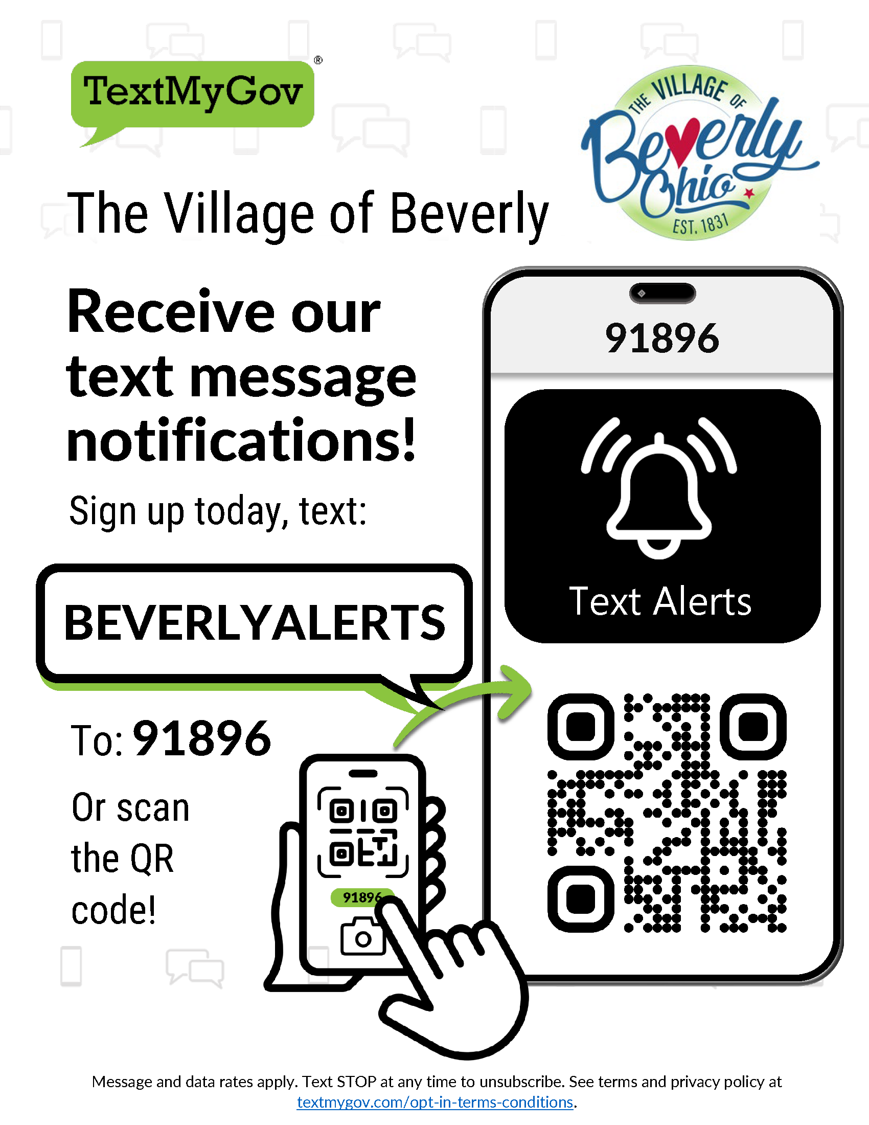 The Village of Beverly is excited to announce the launch of TextMyGov. Another convenient way for residents to communicate with the Village. You can sign up to receive text message notifications about what is happening in the Village- such as Upcoming Events, Water Line Breaks, Boil Advisories, or Road Closures.